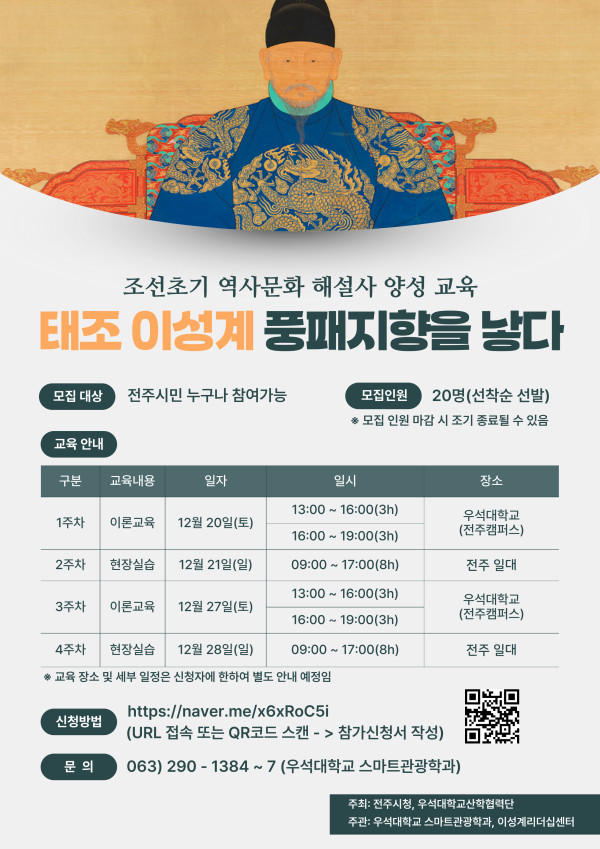 우석대학교 스마트관광학과 · 이성계리더십센터 공동 주관으로 '조선초기 역사문화 해설사 양성교육'이 지난해 12월 20일 부터 28일까지 우석대학교와 전주 일대에서 진행됐다.